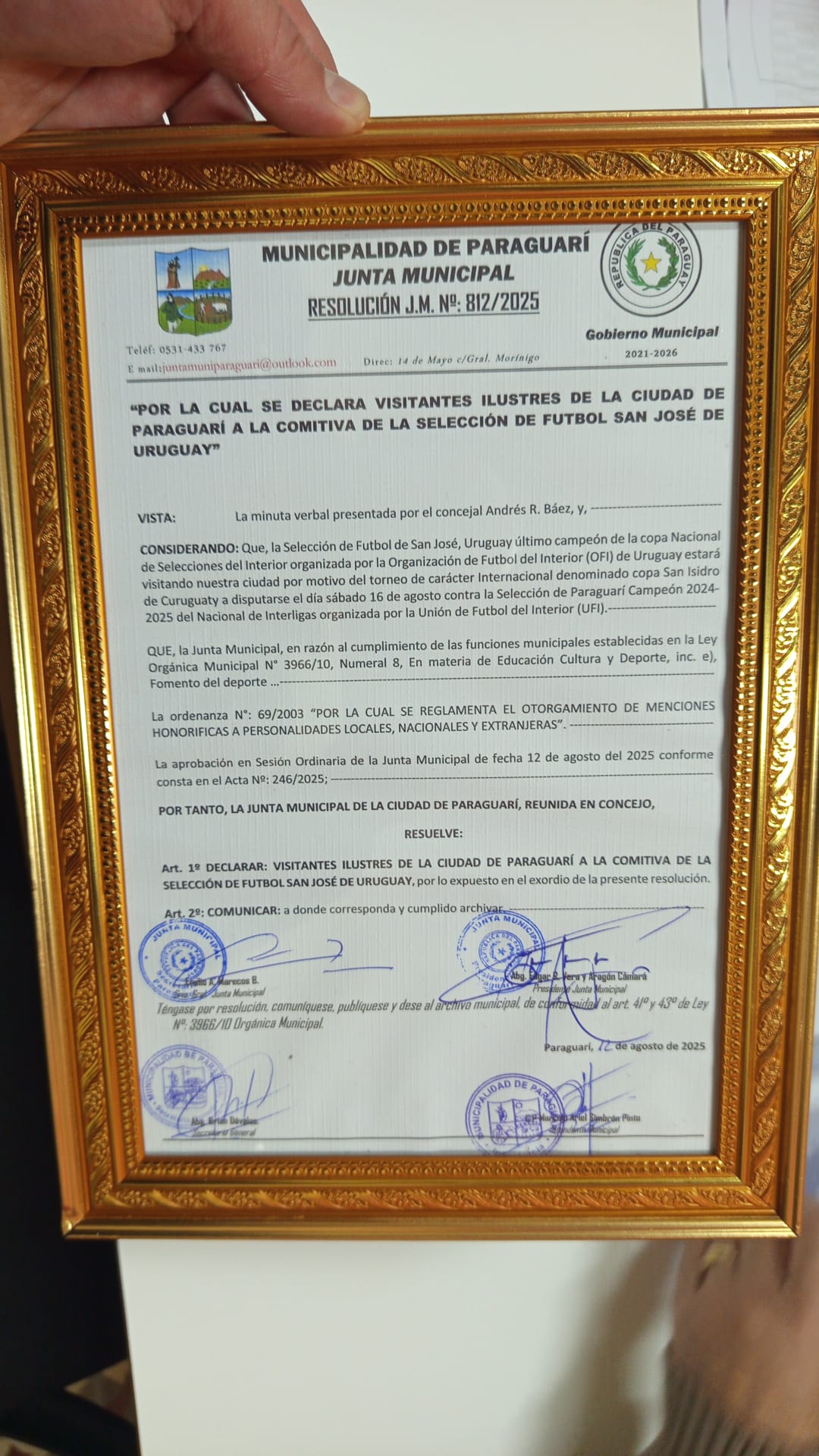 Durante la ceremonia, la Junta Municipal de Paraguarí declaró a la delegación de San José como “Visitantes Ilustres de la ciudad”, distinción que fue entregada oficialmente a los directivos de la Liga Mayor presentes. Asimismo, la Liga Mayor de San José correspondió el gesto realizando entregas protocolares de presentes institucionales.
